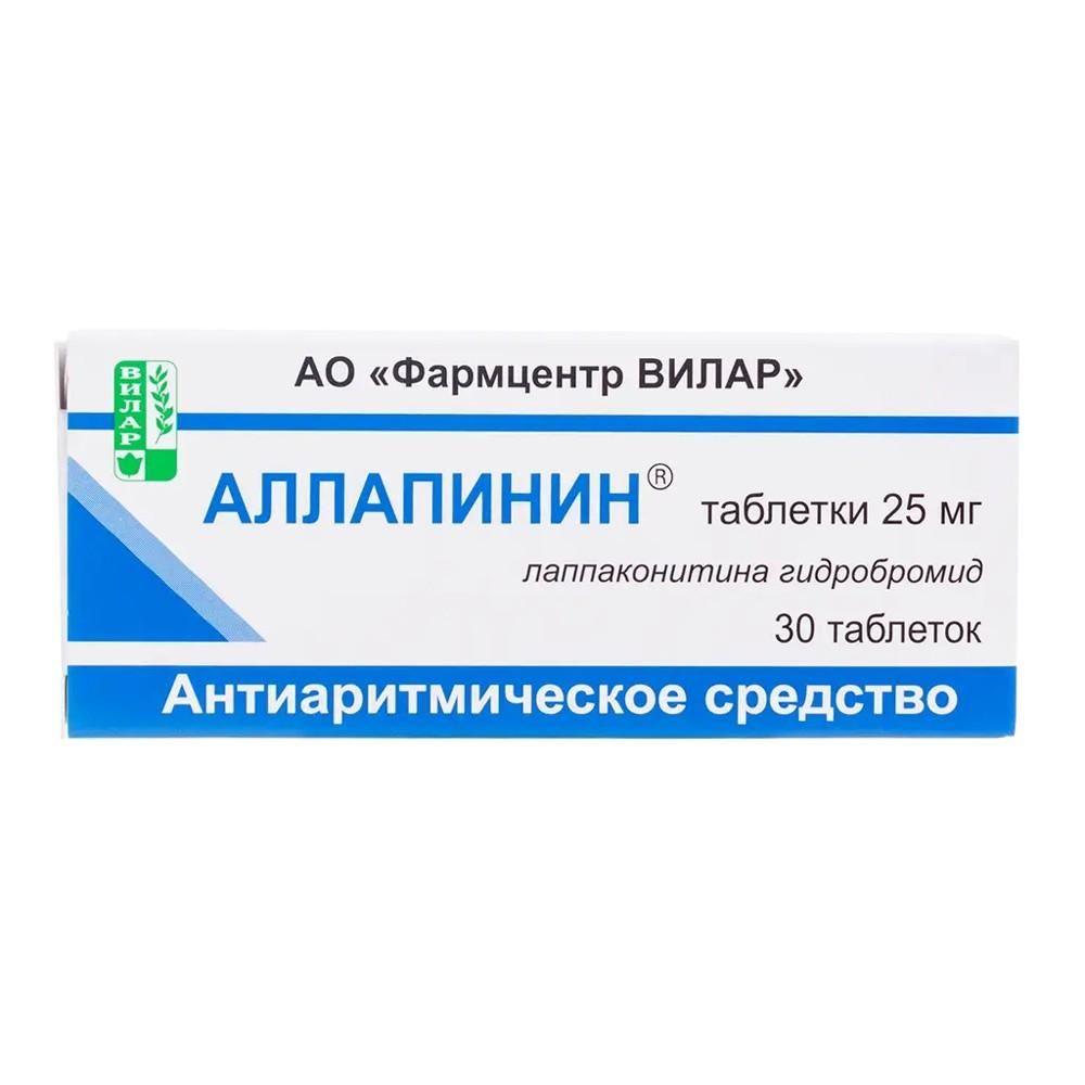 Лаппаконитина гидробромид с сопутствующими алкалоидами (Аллапинин) (в пересчете на 100 % вещество) или Лаппаконитина гидробромид с сопутствующими алкалоидами (Лаппаконитина гидробромид) (в пересчете на 100 % вещество) - 25 мг.