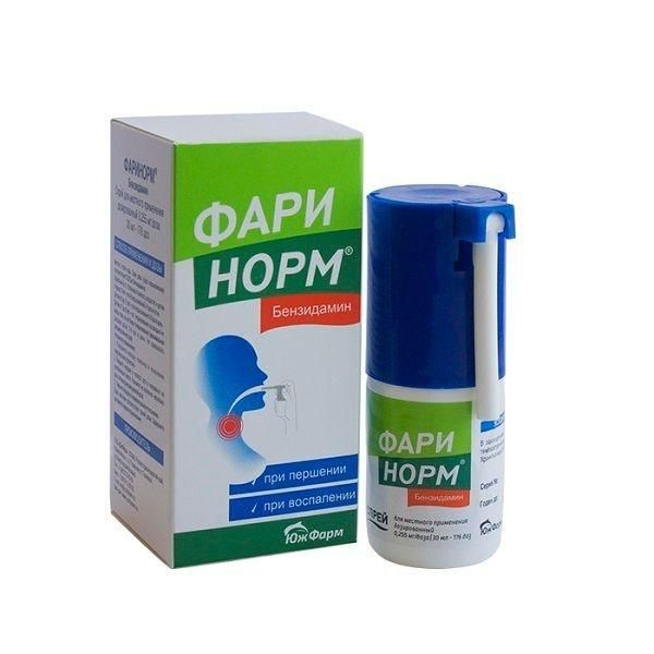 Фаринорм бензидамин 0,255мг/доза 30мл спрей д/пр.местн.доз. (Южфарм ооо) - цены в Екатеринбурге, купить Фаринорм бензидамин 0,255мг/доза 30мл спрей д/пр.местн.доз. в аптеке Фармленд, инструкция по применению, отзывы