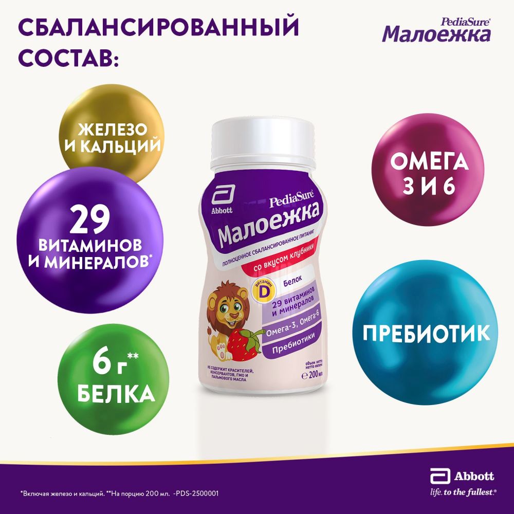 *У детей с недостаточностью питания за счет содержания макро- и микронутриентов. **Пробиотик содержится только в сухой форме продукта. ***Полный список исследований на pediasure.ru. ****Сухая форма продукта представлена 3 вкусами: ваниль, клубника и шоколад. *****По сравнению с PediaSure Малоежка.
