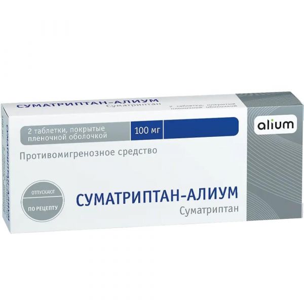Суматриптан 100мг таб.п/об.пл. №2 по цене от 287.16 руб в Екатеринбурге, купить Суматриптан 100мг таб.п/об.пл. №2 (Алиум ао) в аптеке Фармленд, инструкция по применению, отзывы