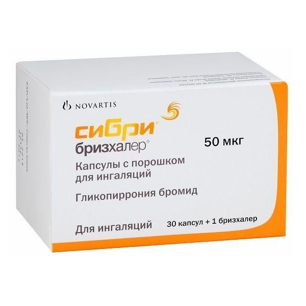 Только для ингаляционного применения!, Препарат Сибри Бризхалер представляет собой капсулы с порошком для ингаляций, который следует применять только для ингаляций через рот с помощью специального устройства для ингаляций Бризхалер, который входит в комплект упаковки. Препарат нельзя принимать внутрь. Капсулы с порошком для ингаляций должны храниться в блистере и извлекаться из него непосредственно перед применением., Рекомендуемая доза препарата Сибри Бризхалер составляет 50 мкг (содержимое 1 капсулы) 1 раз в сутки. Ингаляцию препарата проводят ежедневно 1 раз в сутки в одно и то же время. В случае пропуска ингаляции, следующую дозу необходимо принять как можно быстрее. Пациенты должны быть проинструктированы не принимать более 1 дозы препарата (50 мкг) в сутки., В случае назначения препарата Сибри Бризхалер пациенты должны быть проинструктированы о правильном использовании ингалятора. , Применение у пациентов с почечной недостаточностью, У пациентов с почечной недостаточностью легкой и умеренной степени тяжести может применяться рекомендуемая доза препарата Сибри Бризхалер. У пациентов с тяжелой почечной недостаточностью или терминальной стадией заболевания почек, требующей проведение гемодиализа, препарат Сибри Бризхалер должен применяться в рекомендуемой дозе только в случае, если предполагаемая польза превышает потенциальный риск., Применение у пациентов с печеночной недостаточностью, Специальных клинических исследований у пациентов с печеночной недостаточностью не проводилось. Препарат Сибри Бризхалер выводится преимущественно путем почечной экскреции, поэтому значимого увеличения экспозиции у пациентов с печеночной недостаточностью не предполагается. У пациентов с нарушением функции печени может применяться рекомендуемая доза препарата Сибри Бризхалер., Применение у пациентов пожилого возраста, Препарат Сибри Бризхалер может применяться в рекомендуемой дозе у пациентов в возрасте 75 лет и старше., Указания по применению, Каждая упаковка препарата Сибри Бризхалер содержит:, - Одно ингаляционное устройство - Бризхалер, - Блистеры с капсулами с порошком для ингаляций, Капсулы с порошком для ингаляций нельзя принимать внутрь!, Ингаляционное устройство Бризхалер, находящееся в упаковке, предназначено для использования только вместе с капсулами препарата., Для ингаляции капсул, находящихся в упаковке, используется только ингаляционное устройство Бризхалер., Не используйте капсулы препарата с каким-либо другим ингаляционным устройством и, в свою очередь, не используйте Бризхалер для ингаляции других препаратов., Через 30 дней использования Бризхалер следует выбросить., Как использовать ингалятор., Снимите крышку., Откройте Бризхалер., Чтобы открыть ингалятор, крепко возьмите его за основание и наклоните мундштук., Приготовьте капсулу:, Отделите один блистер от блистер-упаковки, оторвав ее по перфорации., Возьмите один блистер и снимите с него защитную пленку, чтобы высвободить капсулу., Не выдавливайте капсулу через защитную пленку., Выньте капсулу:, Капсулы следует хранить в блистере и вынимать только непосредственно перед применением. Вытрите руки насухо и выньте капсулу из блистера. , Не глотайте капсулу., Вставьте капсулу в Бризхалер:, Положите капсулу в камеру для капсул., Никогда не кладите кап