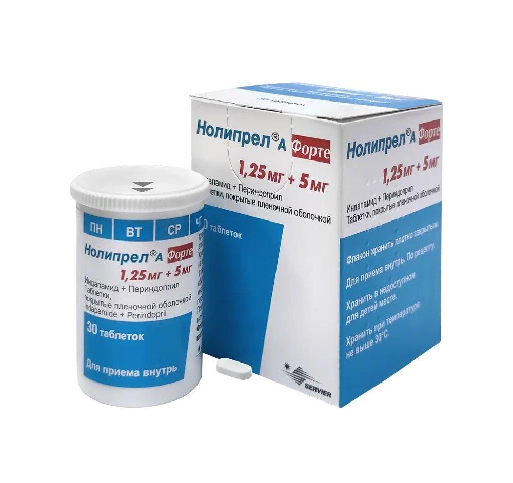 Препарат Нолипрел А Форте содержит комбинацию двух действующих веществ: индапамида и периндоприла. Данный препарат относится к классу препаратов, который называется средствами, действующими на ренин-ангиотензиновую систему, ингибиторами ангиотензинпревращающего фермента (АПФ) в комбинации с диуретиками, и применяется для лечения артериальной гипертензии (снижения повышенного артериального давления).