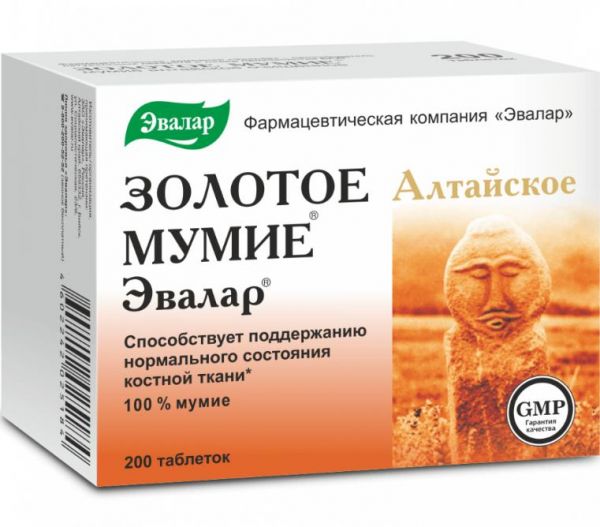 Компания «Эвалар» представляет вашему вниманию средство Золотое мумие алтайского происхождения в удобной форме – в таблетках. Таблетированная форма мумие изготавливается по запатентованной технологии без использования вспомогательных веществ.