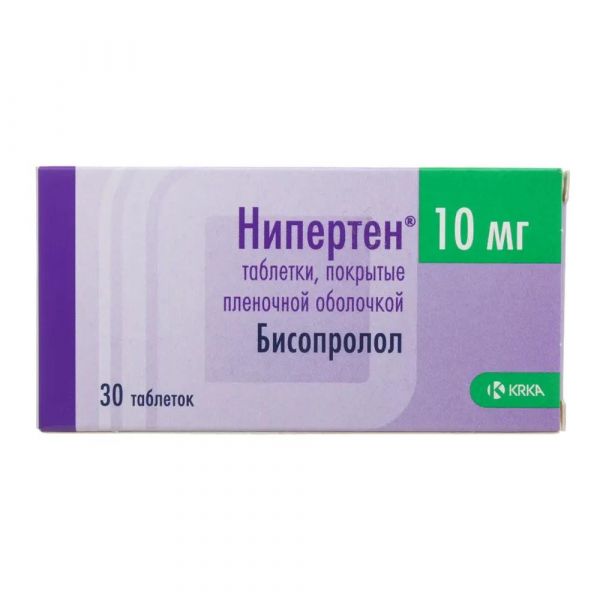Проведение десенсибилизирующей терапии, стенокардия Принцметала, гипертиреоз, сахарный диабет 1 типа и сахарный диабет со значительными колебаниями концентрации глюкозы в крови, AV блокада I степени, тяжелая почечная недостаточность (клиренс креатинина (КК) менее 20 мл/мин), тяжелые нарушения функции печени, псориаз, рестриктивная кардиомиопатия, врожденные пороки сердца или порок клапана сердца с выраженными гемодинамическими нарушениями, ХСН с инфарктом миокарда в течение последних 3-х месяцев, тяжелые формы хронической обструктивной болезни легких, строгая диета, Так как нет достаточного количества данных по применению препарата Нипертен® у детей, не рекомендуется применять препарат у детей до 18 лет., Нарушение функции почек или печени, При нарушении функции печени или почек легкой или умеренной степени обычно коррекции дозы не требуется., При тяжелом нарушении функции почек (КК менее 20 мл/мин.) и у пациентов с тяжелыми заболеваниями печени максимальная суточная доза составляет 10 мг. Увеличение дозы у таких пациентов должно осуществляться с особой осторожностью., Пациенты пожилого возраста, Коррекции дозы не требуется., Не прерывайте лечение препаратом Нипертен® резко и не меняйте рекомендованную дозу без предварительной консультации с врачом, так как это может привести к временному ухудшению деятельности сердца. Лечение не следует прерывать внезапно, особенно у пациентов с ИБС. Если прекращение лечения необходимо, то дозу следует снижать постепенно., При одновременном применении клонидина его прием может быть прекращен только через несколько дней после отмены препарата Нипертен®., На начальных этапах лечения препаратом Нипертен® пациенты нуждаются в постоянном наблюдении., Контроль за состоянием пациентов, принимающих препарат Нипертен®, должен включать измерение ЧСС и АД (в начале лечения – ежедневно, затем – 1 раз в 3-4 месяца), проведение электрокардиограммы, определение концентрации глюкозы в крови у пациентов с сахарным диабетом (1 раз в 4-5 месяцев). У пациентов пожилого возраста рекомендуется следить за функцией почек (1 раз в 4-5 месяцев)., Следует обучить пациента методике подсчета ЧСС и проинструктировать о необходимости консультации врача при ЧСС менее 60 уд/мин., Препарат Нипертен® следует применять с осторожностью в следующих случаях:, · тяжелые формы ХОБЛ и нетяжелые формы бронхиальной астмы;, · сахарный диабет со значительными колебаниями концентрации глюкозы в плазме крови: симптомы выраженного снижения концентрации глюкозы (гипогликемии) такие как тахикардия, ощущение сердцебиения или повышенное потоотделение могут маскироваться;, · строгая диета;, · проведение десенсибилизирующей терапии;, · AV блокада I степени;, · стенокардия Принцметала;, · нарушения периферического артериального кровообращения легкой и умеренной степени (в начале терапии может возникнуть усиление симптомов);, · псориаз (в т. ч. в анамнезе)., В случае выявления у пациентов пожилого возраста нарастающей брадикардии (ЧСС менее 60 уд/мин), выраженного снижения АД (систолическое АД ниже 100 мм рт.ст.), AV блокады, бронхоспазма, желудочковых аритмий, тяжелых нарушений функции печени и/или почек необходимо уменьшить дозу препарата или прекратить лечение., Рекомендуется прекратить терапию при развитии депрессии, вызванной приемом β-адрен