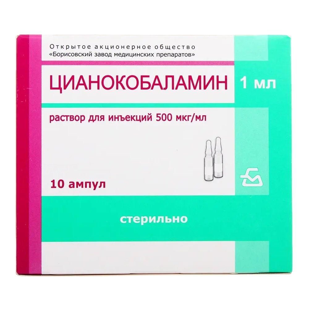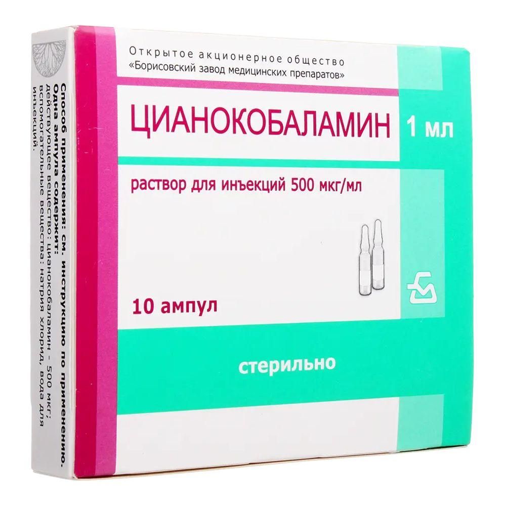 Цианокобаламин (витамин b12) 500мкг/мл 1мл р-р д/ин. №10 амп. Борисовский завод медицинских препаратов оао_5 в Екатеринбурге
