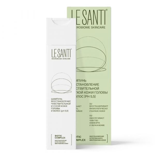 ШАМПУНЬ ВОССТАНОВЛЕНИЕ "LE SANTI®" ЧУВСТВИТЕЛЬНОЙ И СУХОЙ КОЖИ ГОЛОВЫ И ВОЛОС pH 5,5., Для чувствительной, сухой и очень сухой кожи лица и тела, в том числе склонной к атопии., 01/ Стимулирует регенерацию кожи, быстро снимает сухость и раздражение., 02/ Поддерживает здоровье собственного микробиома кожи головы, создавая естественную защиту., 03/ Увлажняет и питает волосяные стержни, обеспечивая ежедневное чувство комфорта.