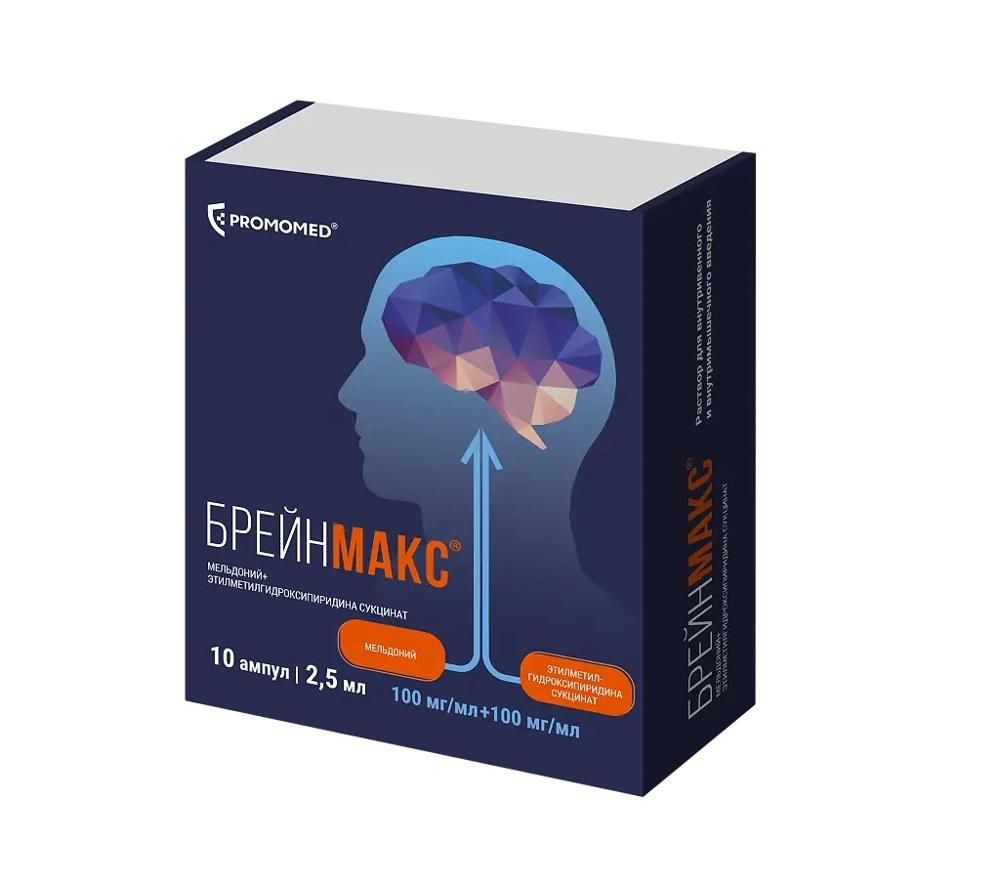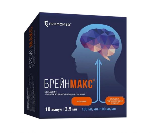 БРЕЙНМАКС® - комбинированный лекарственный препарат, действие которого обусловлено входящими в его состав компонентами. Фармакодинамика Мельдоний Структурный аналог гамма-бутиробетаина. Подавляет гамма-бутиробетаингидроксиназу, угнетает синтез карнитина и транспорт длинноцепочечных жирных кислот через оболочки клеток, препятствует накоплению в клетках активированных форм неокисленных жирных кислот - производных ацилкарнитина и ацилкоэнзима А. В условиях ишемии восстанавливает равновесие процессов доставки кислорода и его потребления в клетках, предупреждает нарушение транспорта аденозинтрифосфата (АТФ); одновременно с этим активирует гликолиз, который протекает без дополнительного потребления кислорода. В результате снижения концентрации карнитина усиленно синтезируется гамма-бутиробетаин, обладающий вазодилатирующими свойствами. Мельдоний в условиях ишемии восстанавливает равновесие процессов доставки кислорода и его потребления в клетках, предупреждает нарушение транспорта АТФ; одновременно с этим активирует гликолиз, который протекает без дополнительного потребления кислорода. Механизм действия определяет многообразие его фармакологических эффектов: повышение работоспособности, уменьшение симптомов психического и физического перенапряжения, активация тканевого и гуморального иммунитета, кардиопротекторное действие. В случае острого ишемического повреждения миокарда замедляет образование некротической зоны, укорачивает реабилитационный период. При сердечной недостаточности повышает сократимость миокарда, увеличивает толерантность к физической нагрузке, снижает частоту приступов стенокардии. При острых и хронических ишемических нарушениях мозгового кровообращения улучшает циркуляцию крови в очаге ишемии, способствует перераспределению крови в пользу ишемизированного участка. Оказывает тонизирующее действие на центральную нервную систему, устраняет функциональные нарушения со стороны соматической и вегетативной нервной системы у больных хроническим алкоголизмом при синдроме абстиненции. Этилметилгидроксипиридина сукцинат Этилметилгидроксипиридина сукцинат является ингибитором свободнорадикальных процессов, мембранопротектором. Обладает антигипоксическим, стресс-протекторным, ноотропным, противосудорожным и анксиолитическим действием. Механизм действия этилметилгидроксипиридина сукцината обусловлен его антиоксидантным и мембранопротекторным действием. Препарат ингибирует перекисное окисление липидов, повышает активность супероксиддисмутазы, повышает соотношение липид-белок, улучшает структуру и функцию мембраны клеток. Этилметилгидроксипиридина сукцинат модулирует активность мембраносвязанных ферментов (кальций-независимой фосфодиэстеразы, аденилатциклазы, ацетилхолинэстеразы), рецепторных комплексов (бензодиазепинового, гамма-аминомасляной кислоты, ацетилхолинового), что усиливает их способность связывания с лигандами, способствует сохранению структурно-функциональной организации биомембран, транспорта нейромедиаторов и улучшению синаптической передачи. Этилметилгидроксипиридина сукцинат повышает содержание в головном мозге дофамина. Вызывает усиление компенсаторной активации аэробного гликолиза и снижение степени угнетения окис