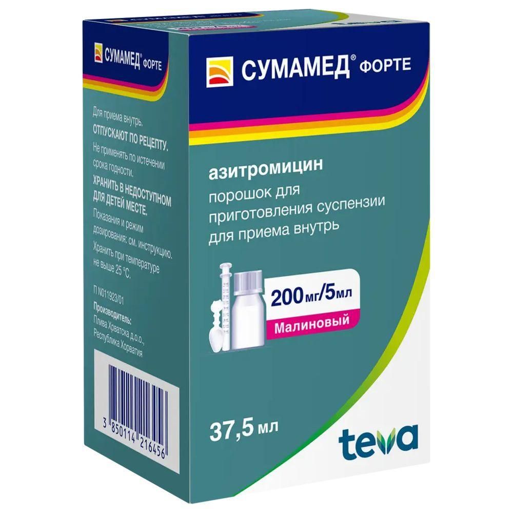 Сумамед форте 200мг/5мл 37,5мл/ 35,57г пор.д/сусп.д/пр.внутр. №1 фл. по цене от 617.62 руб в Екатеринбурге, купить Сумамед форте 200мг/5мл 37,5мл/ 35,57г пор.д/сусп.д/пр.внутр. №1 фл. (Pliva hrvatska d.o.o._1) в аптеке Фармленд, инструкция по применению, отзывы