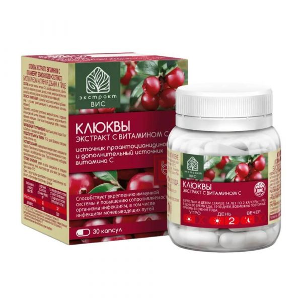 В качестве биологически активной добавки к пище – источника проантоцианидинов и дополнительного источника витамина С. Биокомплекс способствует укреплению иммунной системы, поддержке антиоксидантной системы организма и повышению сопротивляемости организма инфекциям, в том числе мочевыводящих путей и снижению риска их рецидива., "Экстракт ВИС" - российский бренд растительных биодобавок для поддержки здоровья. При производстве "Экстракт ВИС" используются стандартизированные экстракты растений, что обеспечивает высокую точность дозирования и контролируемый уровень содержания активных веществ в 1 капсуле., Состав активных компонентов «КЛЮКВЫ ЭКСТРАКТ с витамином С» на 1 капсулу:, Экстракт клюквы (сертифицирован и стандартизирован по проантоцианидинам) - 120 мг, Виатмин С -99 мг, Рекомендуемый суточный прием (2 капс.) содержит: 36 мг PAC (проантоцианидинов) и 198 мг витамина С., Клюква уже давно ассоциируется с поддержкой здоровья мочевыводящих путей. При приёме экстракта клюквы внутрь, проантоцианидины накапливаются в моче и препятствуют прикреплению и размножению бактерий на поверхности слизистой мочевыводящих путей, препятствуют формированию биопленок, способствуют выведению патогенных бактерий из мочевыводящих путей и мочевого пузыря., Витамин С оказывает неспецифическое общестимулирующее влияние на организм, повышает адаптационные способности организма и его сопротивляемость к инфекциям; способствует процессам регенерации.
