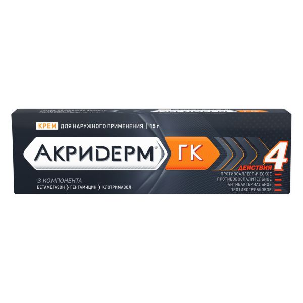 Крем Акридерм ГК не предназначен для применения в офтальмологии. Пациенты, применяющие системные глюкокортикостероиды или глюкокортикостероиды для наружного применения, сообщали о нарушениях зрения. Если у пациента наблюдается нечеткость зрения или другие зрительные нарушения, следует обратиться к офтальмологу для оценки возможных причин, которые могут включать катаракту, глаукому, серозную хориоретинопатию. , Продолжительное наружное применение антибиотиков иногда может приводить к росту резистентной микрофлоры. В этом случае, а также при развитии раздражения, сенсибилизации или суперинфекции при применении препарата Акридерм ГК, лечение следует прекратить и назначить соответствующую терапию. Наблюдались перекрестные аллергические реакции с аминогликозидными антибиотиками. Любые побочные эффекты, встречающиеся при применении системных глюкокортикостероидов, включая угнетение функции коры надпочечников, могут отмечаться и при применении глюкокортикостероидов для наружного применения, в особенности у детей., Системная абсорбция глюкокортикостероидов или гентамицина при местном применении будет выше, если лечение будет проводиться на больших участках кожи или при использовании окклюзионных повязок, особенно при длительном лечении или при нарушении целостности кожных покровов. Необходимо избегать нанесения гентамицина на открытые раны и поврежденную кожу. В противном случае возможно появление побочных эффектов, характерных для гентамицина при его системном применении. Следует соблюдать соответствующие меры предосторожности в таких случаях, особенно при лечении детей. , При длительном использовании препарата его отмену рекомендуется проводить постепенно., Дети, Дети более подвержены риску угнетения функции гипоталамо-гипофизарно-надпочечниковой системы вследствие применения глюкокортикостероидов для наружного применения, чем взрослые, из-за большего соотношения у них площади поверхности тела и веса и, соответственно, повышенной абсорбции препарата. У детей это определяется низким уровнем кортизола в плазме крови и отсутствием ответа на стимуляцию адренокортикотропного гормона. Возможно возникновение синдрома Иценко-Кушинга, нарушение роста и развития, замедление прибавки веса, повышение внутричерепного давления, проявляющегося выпячиванием родничка, головными болями, двусторонним отеком диска зрительного нерва. Длительное применение препарата у детей должно проводиться по строгим показаниям и под контролем врача. У детей чаще, чем у взрослых, возникают атрофические изменения кожи при наружном применении глюкокортикостероидов. Курс лечения должен ограничиться пятью днями. Окклюзионные повязки не должны применяться., Влияние на способность управлять транспортными средствами, механизмами, Некоторые побочные реакции, такие как нарушение зрения могут снижать психомоторную реакцию и способность к концентрации и в связи с этим повысить риск в ситуациях, в которых наличие этих способностей особенно важно (например, при управлении автомобилем или другими механизмами).