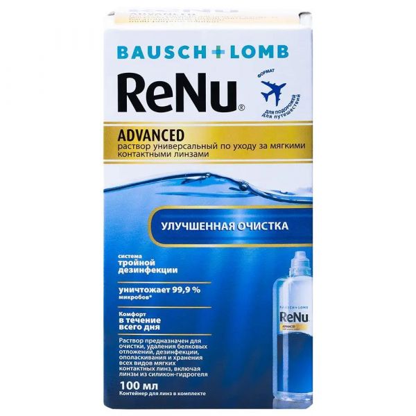 Раствор универсальный ReNu® Advanced по уходу за мягкими контактными линзами. Предназначен для очищения, удаления белка, дезинфекции, ополаскивания и хранения любых контактных линз, включая силикон-гидрогелевые линзы.