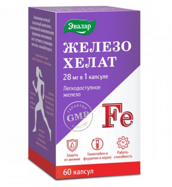 Для максимального усвоения1 железа попробуйте легко усваиваемый хелатный комплекс Железо хелат Эвалар. Железо хелат Эвалар содержит высокую дозировку железа (28 мг в 1 капсуле) и необходимые для лучшего усвоения железа витамины нового поколения в коэнзимных формах (витамин С, В9 и В12).