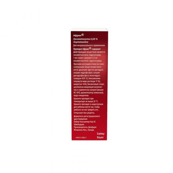За счет наличия в составе лекарственного препарата вспомогательных веществ (целлюлозы микрокристаллической и кармеллозы натрия и повидона-К29-32) Африн спрей назальный не вытекает из носа и не стекает в горло, так как после введения в носовые ходы спрей становится более вязким и удерживается на слизистых оболочках носа более эффективно, чем стандартный водный раствор. По данным клинических исследований лекарственный препарат начинает действовать в течение 1 минуты и действие продолжается до 12 часов.
