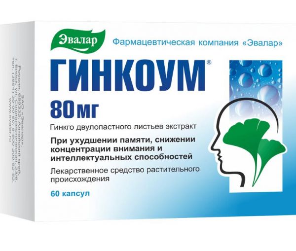 Гинкоум 80мг капс. №60 по цене от 1414.00 руб в Екатеринбурге, купить Гинкоум 80мг капс. №60 (Эвалар зао_2) в аптеке Фармленд, инструкция по применению, отзывы