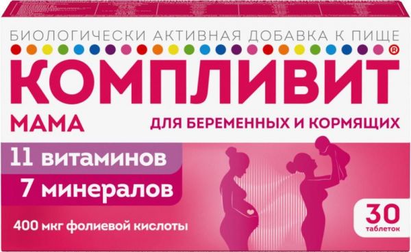 БАД «Компливит® «Мама» для беременных и кормящих» представляет собой комплекс витаминов и минералов, предназначенный для снижения риска гиповитаминоза и дефицита минеральных веществ во время беременности и грудного вскармливания. По данным литературных источников: Во время беременности возрастает суточная потребность организма в витаминах и минеральных веществах на 30–50 %, дефицит витаминов и микроэлементов на этапе планирования и во время беременности может быть фактором риска ее осложненного течения, причиной нарушения закладки тканей и органов плода, формирования пороков внутриутробного развития. Так, например, фолиевая кислота при планировании беременности является одним из самых важных витаминов, при ее дефиците в организме матери существенно повышается риск развития дефектов нервной трубки. Комплекс содержит 11 витаминов, 7 минералов, данный комплекс создан с учетом потребностей женщин в витаминах и минералах во время беременности, в период кормления грудью. Совместимость компонентов, входящих в состав БАД «Компливит® «Мама» для беременных и кормящих», обеспечена специальной технологией. Действие комплекса обусловлено эффектами входящих в его состав компонентов: α-Токоферола ацетат (витамин Е) обладает антиоксидантными свойствами, поддерживает стабильность эритроцитов, предупреждает гемолиз; оказывает положительное влияние на функции половых желез, нервной и мышечной ткани. Способствует нормальным сперматогенезу, развитию плода и течению беременности. Ретинол (витамин А) играет важную роль в окислительно-восстановительных процессах, участвует в синтезе мукополисахаридов, белков, липидов. Способствует нормальному развитию эмбриональных тканей, в т. ч. эпителиальных структур и костной ткани. Участвует в формировании зрительных пигментов, необходимых для нормального сумеречного и цветового зрения; обеспечивает целостность эпителиальных тканей, регулирует рост костей. Тиамин (витамин В1) - в качестве коэнзима участвует в углеводном обмене, функционировании нервной системы. Рибофлавин (витамин В2) - важнейший катализатор процессов клеточного дыхания и зрительного восприятия. Пиридоксин (витамин В6) - в качестве коэнзима принимает участие в белковом обмене и синтезе нейромедиаторов. Цианокобаламин (витамин В12) - участвует в синтезе нуклеотидов, является важным фактором нормального роста, кроветворения и развития эпителиальных клеток; необходим для метаболизма фолиевой кислоты и синтеза миелина. Никотинамид (витамин РР) - участвует в процессах тканевого дыхания, жирового и углеводного обмена. Аскорбиновая кислота (витамин С) - необходима для синтеза коллагена; участвует в формировании и поддержании структуры и функции хрящей, костей, зубов; влияет на образование гемоглобина, созревание эритроцитов. Витамин С повышает устойчивость организма к инфекциям. Кальция пантотенат - в качестве составной части коэнзима А играет важную роль в процессах ацетилирования и окисления; способствует построению, регенерации эпителия и эндотелия. Фолиевая кислота - принимает участие в синтезе аминокислот, нуклеотидов, нуклеиновых кислот; необходима для нормального эритропоэза. На ранних стадиях беременности снижает риск развития у плода дефектов нервной трубки. Дефицит витамина на ранних сроках беременности мо