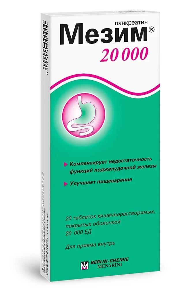 Мезим 20000 таб.п/об.киш/раств. №20 по цене от 244.00 руб в Екатеринбурге, купить Мезим 20000 таб.п/об.киш/раств. №20 (Berlin-chemie ag_2) в аптеке Фармленд, инструкция по применению, отзывы