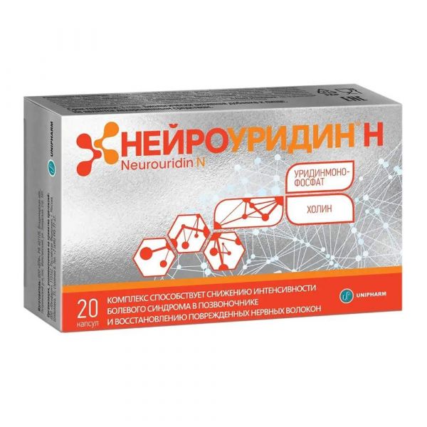 НЕЙРОУРИДИН® Н — КОМБИНАЦИЯ НЕЙРОТРОПНЫХ ВЕЩЕСТВ УРИДИНМОНОФОСФАТА И ХОЛИНА., Компоненты Нейроуридин® Н способствуют снижению интенсивности болевого синдрома, в том числе в области шейного, грудного и поясничного отдела позвоночника, и восстановлению поврежденных нервных волокон., Свойства продукта обусловлены свойствами компонентов, входящих в его состав., Уридинмонофосфат (УМФ) — важнейший нуклеотид, необходимый для поддержания обменных процессов (метаболизма) в нервной ткани. УМФ участвует в процессах роста и развития нервных клеток (нейронов), образования миелиновых оболочек нервов., УМФ способствует формированию новых связей между нейронами и улучшению процессов взаимодействия между ними за счет образования молекул, передающих нервный импульс от клетки к клетке, — ацетилхолина и допамина. Участвует в регуляции болевой чувствительности., Противоболевой эффект УМФ реализуется за счет прямой блокады болевого импульса, а также подавления продукции молекул воспаления, образующихся при повреждении тканей. Уридинмонофосфат имеет особое значение для восстановления (регенерации) поврежденных нервных волокон. Под влиянием УМФ активируется продукция миелиновой оболочки нерва, которая обеспечивает защиту нервного волокна и лучшее проведение нервного импульса, в результате чего улучшается проведение нервных импульсов, улучшается чувствительность и снижается интенсивность болевого синдрома в пораженных тканях., УМФ влияет на дофаминергические системы мозга, способствует благоприятному влиянию на психоэмоциональную сферу, улучшению настроения, общего самочувствия и возрастанию стрессоустойчивости., Важной функцией УМФ является его роль в поддержании процессов памяти и познавательных процессов (запоминания и обучения). Это достигается благодаря усиленному образованию связей между нейронами и улучшению процессов взаимодействия между ними за счет образования молекул, передающих нервный импульс от клетки к клетке, — ацетилхолина и допамина., УМФ способствует защите клетки от гипоксии (кислородного голодания), увеличению синтеза гликогена и повышению энергетического потенциала организма, снижению усталости и увеличению мышечной силы., Нервные клетки не имеют собственных энергетических ресурсов для производства нуклеотидов. Обеспечение нервных клеток уридином осуществляется через ток крови от других клеток, а также с пищей и добавками, содержащими уридин-5-монофосфат. При поражении периферических нервов потребность в уридинмонофос- фате повышается. Поэтому его поступление в организм извне имеет важнейшее значение для поддержания функций нервной системы и процессов восстановления (регенерации) нервных клеток и волокон., Холин является одним из основных компонентов мембран клеток головного мозга и миелиновых оболочек нервных волокон. Холин необходим для производства ацетилхолина, который участвует в осуществлении функции возбудимости и передачи нервных импульсов. Холин способствует улучшению передачи нервно-мышечных сигналов, повышению скорости передачи импульсов по нервным волокнам. Холин также участвует в процессах регуляции боли, дополняя противоболевое действие УМФ. Холин необходим для поддержания функций мозга и нервной системы, таких как память, восприятие, настроение., Компонеты Ней