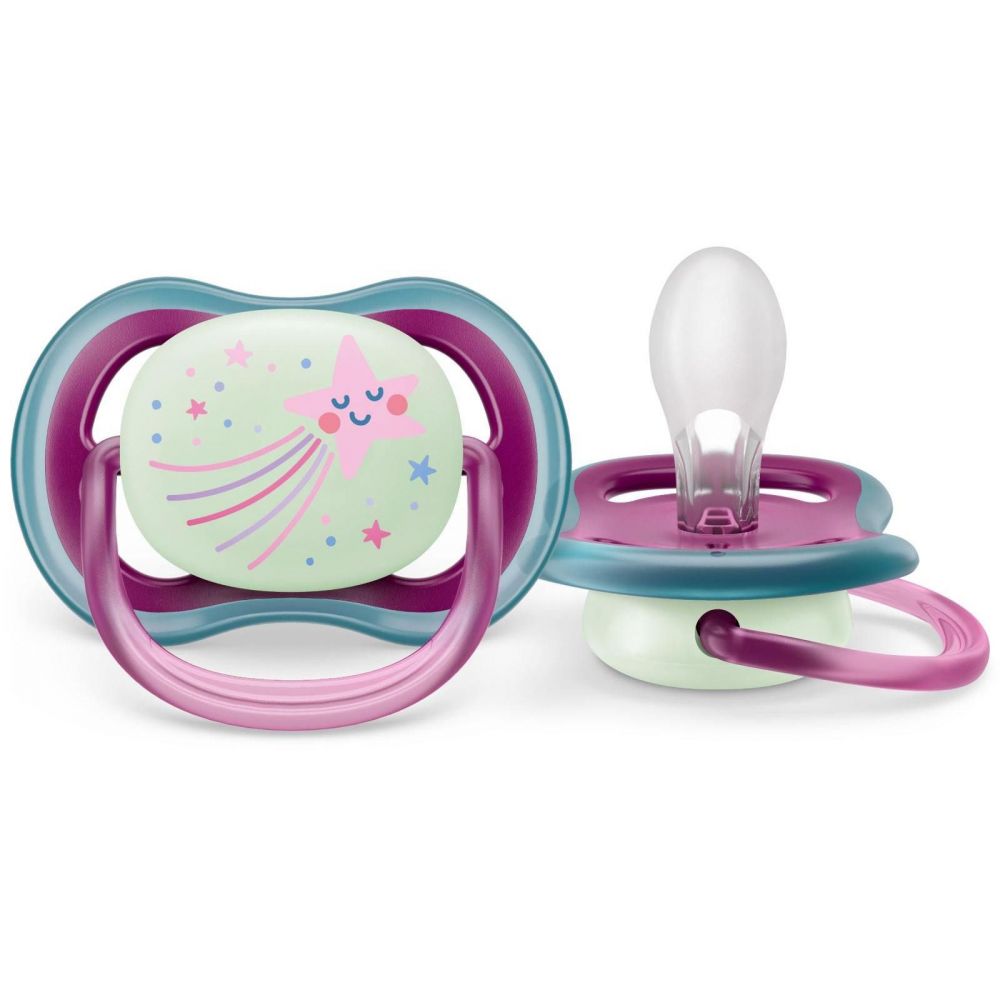 Успокойте своего малыша с помощью соски-пустышки Philips Avent ultra air night SCF376/14, которая позволяет коже дышать и которую легко найти ночью. Пустышка Philips Avent ultra air night имеет большие вентиляционные отверстия, поддерживающие сухость кожи. На пустышке есть светящаяся в темноте кнопка, которая позволяет найти пустышку при выключенном свете. Максимально комфортная пустышка. Пустышки Philips Avent: мамы доверяют, малыши любят, педиатры рекомендуют¹., Позволяет коже малыша дышать. Большие отверстия для воздуха проветривают кожу малыша, обеспечивая ее сухость во время использования пустышки. , Длительная подсветка в темноте. Легко находите пустышку ultra air night благодаря светящейся в темноте кнопке без необходимости включать свет. Свечение в темноте происходит за счет безопасного флуоресцентного компонента. , В 98 % случаев ребенок принимает соску². Когда мы узнали у родителей, как малыши реагируют на наши бархатистые силиконовые соски, в среднем 98 % опрошенных сказали, что ребенок легко принимает пустышки Philips Avent ultra soft и ultra air., Соска на 100 % состоит из пищевого силикона. Мы специально выбрали силикон для изготовления наших пустышек, поскольку это безопасный и инертный материал, широко применяемый в медицинской сфере, который не содержит вредные химические соединения, вредные для эндокринной системы вещества (включая бисфенол-А) и аллергены. , Для естественного развития зубов. Наши ортодонтические, симметричные и мягкие силиконовые соски способствуют естественному и правильному развитию полости рта. , Комфорт для малыша. Наша текстурированная силиконовая соска, имитирующая форму материнской груди, помогает успокоить малыша. , Один чехол для стерилизации и хранения. Дорожный чехол, поставляемый с нашими пустышками ultra soft и ultra air, выполняет функцию стерилизатора. Вам просто нужно добавить воды и положить его в микроволновую печь. Пустышка вновь будет чистой перед следующим использованием. Для максимального эффекта стерилизуйте пустышку не менее 3-х минут., Разработано и произведено в Нидерландах. Пустышки ultra soft и ultra air разработаны и произведены в Нидерландах. , ¹По результатам исследования «Baby Index-2022/2»; «MEDI-Q», проведенного весной 2022 года (март-май), компании ООО «Ипсос Комкон» в категориях молокоотсосов и приспособлений для кормления. , ²Согласно результатам тестов с участием покупателей, проведенных в США в 2016–2017 гг., в среднем 98 % малышей принимают бархатистую соску Philips Avent, которая используется в пустышках серии ultra air и ultra soft.
