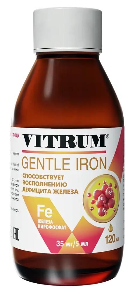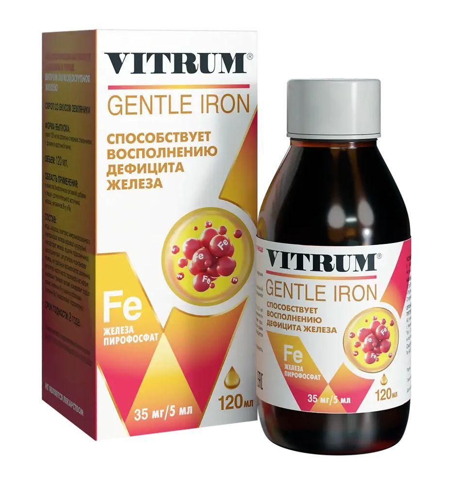 недостаточное поступление железа с пищей, диеты (в том числе вегетарианство), снижение всасываемости железа из-за нарушения работы ЖКТ, повышенная потребность в железе во время беременности, кровопотери (например, регулярные кровопотери во время месячных, при геморрое), потребление большого количества кофе и черного чая с едой, Железо помогает поддерживать многие важные функции организма. Его недостаток оказывает негативное влияние на самочувствие человека., Железо - важный компонент гемоглобина, содержащегося в красных кровяных тельцах (эритроцитах). Гемоглобин содержит около двух третей железа в организме. Он соединяется с кислородом, а эритроциты разносят его из легких по всему телу. Благодаря железу со своими функциями лучше справляется иммунная система, а эритроциты с его помощью отправляют углекислый газ в легкие для переработки. Оно также необходимо для поддержания здоровья клеток кожи, волос и ногтей., Организм не вырабатывает железо самостоятельно, человек получает этот элемент вместе с пищей. При этом происходят и ежедневные физиологические потери железа с ороговевшими клетками кожи и кишечника., Если наступает железодефицит, то ткани и мышцы перестают получать необходимый объем кислорода, который способствует их эффективному функционированию. Это может впоследствии привести к анемии., Ситуации, которые могут привести к возникновению железодефицитного состояния:, По рекомендациям ВОЗ* всем менструирующим женщинам и девочкам-подросткам предлагается принимать железо в количестве от 30 до 60 мг ежедневно в течение 3 месяцев подряд в год., * ссылка на рекомендации ВОЗ, БИОЛОГИЧЕСКИ АКТИВНАЯ ДОБАВКА К ПИЩЕ ВИТРУМ ЛЕГКОДОСТУПНОЕ ЖЕЛЕЗО, VITRUMâ GENTLE IRON содержит в 5 мл 35 мг микрокапсулированного железа (пирофосфат трехвалентного железа), применение которого позволяет повысить его всасываемость (экспериментальные данные) и имеет более низкие риски проявления нежелательных эффектов солей двухвалентного железа. Применение микрокапсулированного железа может быть полезно людям с высоким риском дефицита железа.