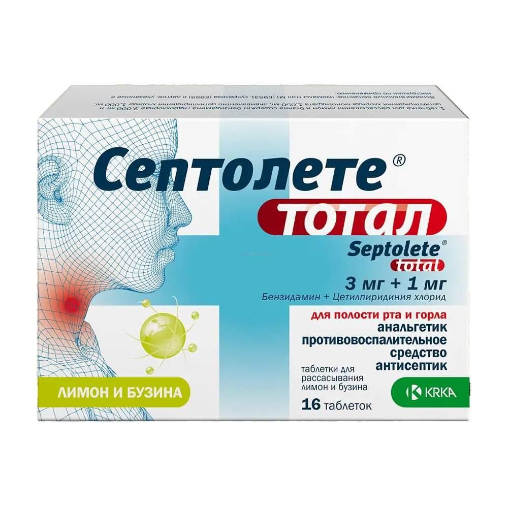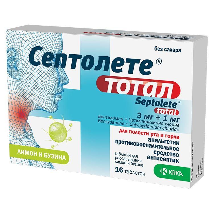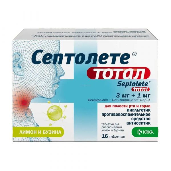 Септолете тотал 3мг+1мг таб.д/рассас. №16 лимон и бузина по цене от 439.00 руб в Екатеринбурге, купить Септолете тотал 3мг+1мг таб.д/рассас. №16 лимон и бузина (Krka d.d._2) в аптеке Фармленд, инструкция по применению, отзывы