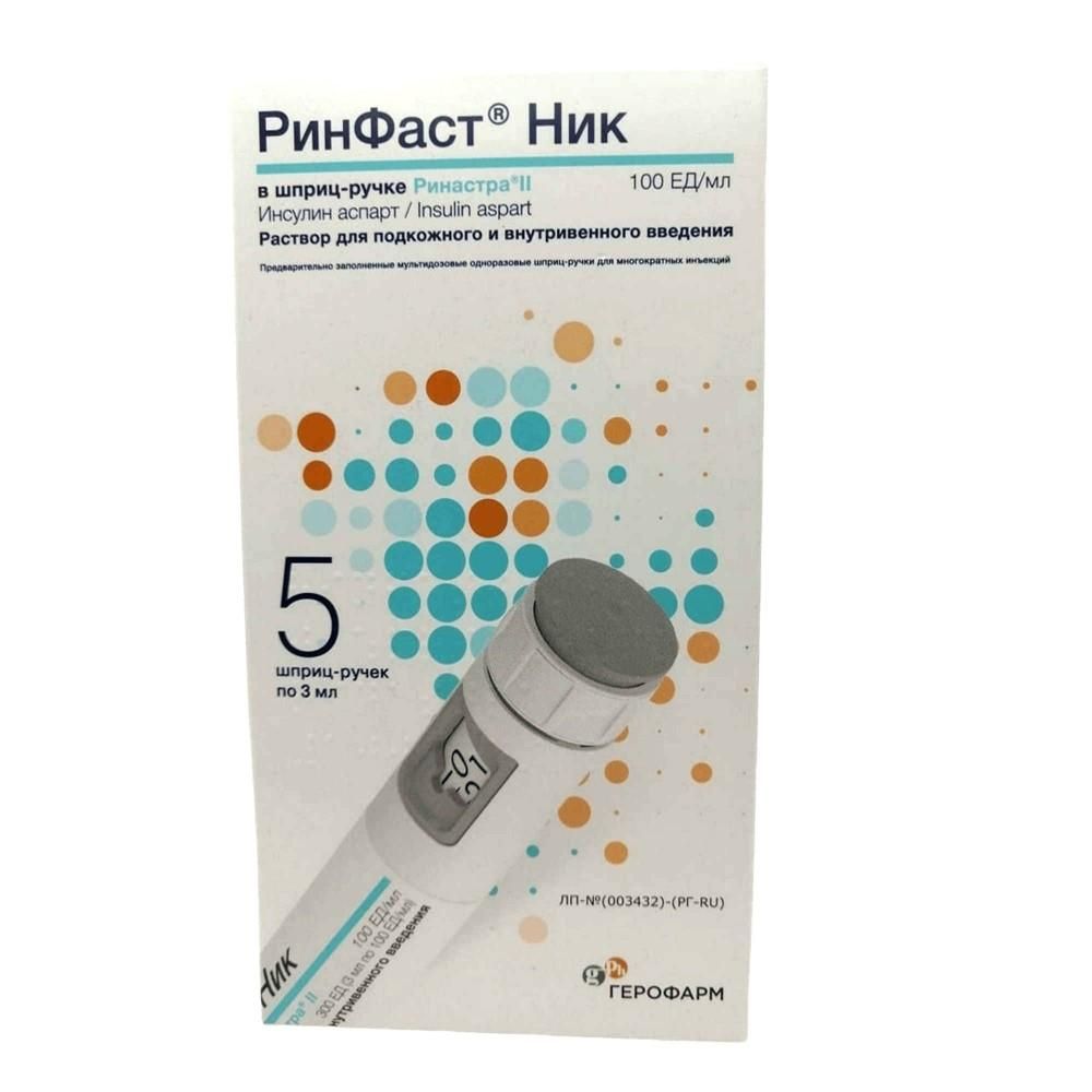 Препарат РинФаст® Ник, 100 ЕД/мл, раствор для подкожного и внутривенного введения. По 3 мл в бесцветные стеклянные картриджи нейтрального стекла (1 гидролитический класс) с плунжерами резиновыми, обкатанные колпачками комбинированными из алюминия с дисками резиновыми. На каждый картридж наклеивают этикетку из пленки прозрачной полипропиленовой. По 5 картриджей в контурную ячейковую упаковку из пленки поливинилхлоридной или пленки полиэтилентерефталатной и фольги алюминиевой. По 1 контурной ячейковой упаковке с листком-вкладышем помещают в пачку из картона. По 3 мл в бесцветные стеклянные картриджи нейтрального стекла (1 гидролитический класс), с плунжерами резиновыми, обкатанные колпачками комбинированными из алюминия с дисками резиновыми. Картридж устанавливают в пластиковую мультидозовую одноразовую шприц-ручку для многократных инъекций Ринастра® II / Ринастра® III / Geropharm® Pen. На корпус каждой шприц-ручки наклеивают этикетку из пленки полипропиленовой. По 5 предварительно заполненных мультидозовых одноразовых шприц-ручек для многократных инъекций с листкомвкладышем и инструкцией по использованию шприц-ручки помещают в пачку из картона.