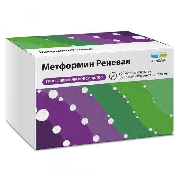 Таблетки, покрытые пленочной оболочкой. Метформин Реневал, 500 мг, таблетки, покрытые пленочной оболочкой Метформин Реневал, 850 мг, таблетки, покрытые пленочной оболочкой Метформин Реневал, 1000 мг, таблетки, покрытые пленочной оболочкой По 10, 15, 20 таблеток в контурную ячейковую упаковку из пленки поливинилхлоридной и фольги алюминиевой печатной лакированной (для дозировок 500 мг, 850 мг). По 10, 15 таблеток в контурную ячейковую упаковку из пленки поливинилхлоридной и фольги алюминиевой печатной лакированной (для дозировки 1000 мг). 3, 6, 9, 10 контурных ячейковых упаковок по 10 таблеток или 2, 4, 6 контурных ячейковых упаковок по 15 таблеток, или 3, 5 контурных ячейковых упаковок по 20 таблеток с инструкцией по применению (листком-вкладышем) помещают в пачку из картона для потребительской тары (для дозировок 500 мг, 850 мг). 3, 5, 6, 9, 10, 12 контурных ячейковых упаковок по 10 таблеток или 2, 3, 4, 6, 8 контурных ячейковых упаковок по 15 таблеток с инструкцией по применению (листком-вкладышем) помещают в пачку из картона для потребительской тары (для дозировки 1000 мг).