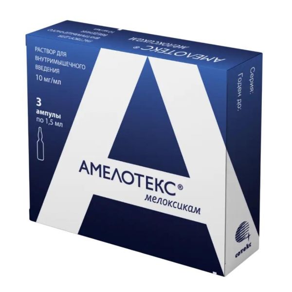 Амелотекс 10мг/мл 1.5мл р-р д/ин.в/м. №3 амп. по цене от 432.00 руб в Екатеринбурге, купить Амелотекс 10мг/мл 1.5мл р-р д/ин.в/м. №3 амп. (Сотекс фармфирма зао_2) в аптеке Фармленд, инструкция по применению, отзывы