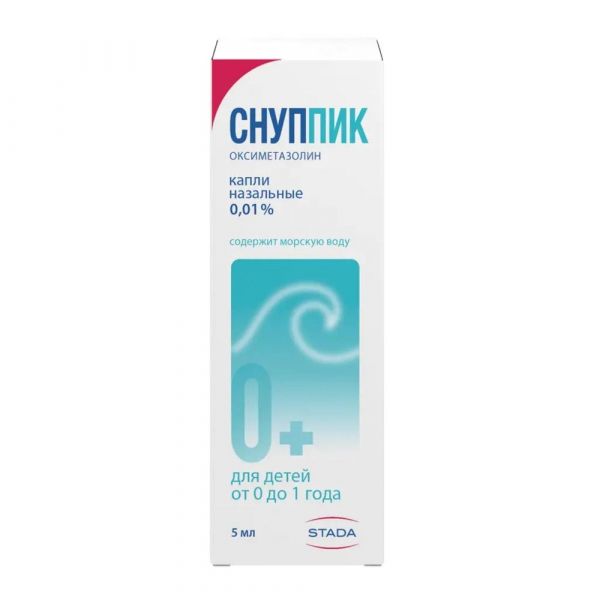 Препарат СНУППИК капли назальные 0,01 % предназначен для применения у детей в возрасте до 1 года., Интраназально., Детям в возрасте до 4 недель – по 1 капле в каждую ноздрю 2-3 раза в день. , Детям с 5-ой недели жизни и до 1 года – по 1-2 капли в каждую ноздрю 2-3 раза в день. , 1 капля препарата СНУППИК содержит 2,8 мкг оксиметазолина гидрохлорида., Перед применением очистить полость носа. Снять с флакона защитный колпачок, флакон перевернуть таким образом, чтобы носик насадки был направлен вниз, ввести насадку в полость носа, для введения 1 капли нажать на ободок насадки 1 раз. Препарат следует закапывать, запрокинув голову ребенку. , Доказана эффективность также и следующей процедуры: в зависимости от возраста 1-2 капли препарата наносят на вату и протирают каждую ноздрю., Если симптомы усиливаются или улучшение не наступает в течение 3-х дней, необходимо проконсультироваться с врачом., В рекомендованной дозе без консультации с врачом применять не более 7-ми дней., Дозы, выше рекомендованных, можно применять только под наблюдением врача., При частом и длительном использовании препарата ощущение «заложенности» носа может появиться вновь или усилиться. При появлении этих симптомов следует прекратить лечение и обратиться к врачу.