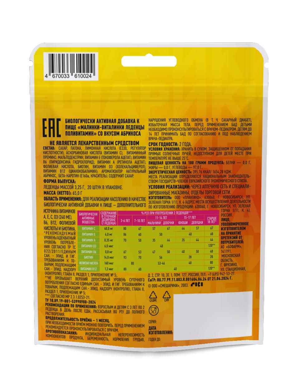 Малинки-виталинки 3,25г леденцы №20 поливит. абрикос бад Плантико ооо в Екатеринбурге