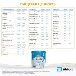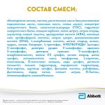 Состав: обезжиренное молоко, лактоза, растительные масла (высокоолеиновое подсолнечное масло, кокосовое масло, соевое масло), концентрат сывороточного белка, галактоолигосахариды (ГОС), гидролизат сывороточного белка, кальция карбонат, калия цитрат, натрия хлорид, эмульгатор соевый лецитин, арахидоновая кислота (АRA), калиевые соли ортофосфорной кислоты, натрия цитрат, докозагексаеновая кислота (DHA), L-аскорбиновая кислота, магния хлорид, инозит, таурин, холина битартрат, L-триптофан, НУКЛЕОТИДЫ (цитидин 5’-монофосфат, динатрия уридин 5’-монофосфат, aденозин 5’-монофосфат, динатрия гуанозин 5’-монофосфат), аскорбилпальмитат, железа (II) сульфат, холина хлорид, цинка сульфат, антиокислитель смесь токоферолов, L-карнитин, никотинамид, D-пантотенат кальция, меди сульфат, ретинола пальмитат, тиамина гидрохлорид, пиридоксина гидрохлорид, бета-каротин, марганца сульфат, фолиевая кислота, рибофлавин, филлохинон, йодид калия, селенит натрия, D-биотин, холекальциферол, цианокобаламин.