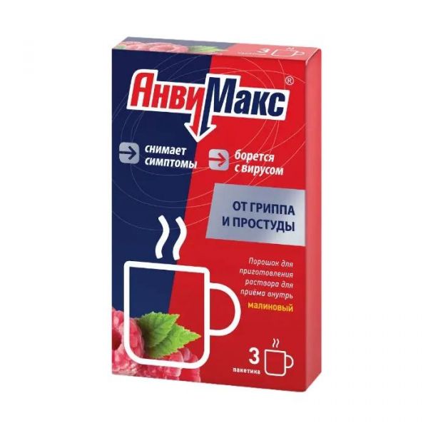Внутрь., Растворить содержимое одного пакетика в половине стакана (100 мл) кипяченой теплой воды. Употребить сразу после растворения. Перед употреблением раствор размешать., Взрослым: принимать по 1 пакетику 2-3 раза в сутки после еды. Интервал между приемами препарата — 4-6 часов. Курс терапии 3-5 дней до исчезновения симптомов заболевания. АнвиМакс® не следует принимать более 5 дней., Если не наблюдается облегчения симптомов в течение 3-х дней после начала приема препарата, необходимо обратиться к врачу.