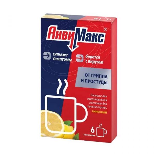 Внутрь., Растворить содержимое одного пакетика в половине стакана (100 мл) кипяченой теплой воды. Употребить сразу после растворения. Перед употреблением раствор размешать., Взрослым: принимать по 1 пакетику 2-3 раза в сутки после еды. Интервал между приемами препарата — 4-6 часов. Курс терапии 3-5 дней до исчезновения симптомов заболевания. АнвиМакс® не следует принимать более 5 дней., Если не наблюдается облегчения симптомов в течение 3-х дней после начала приема препарата, необходимо обратиться к врачу.