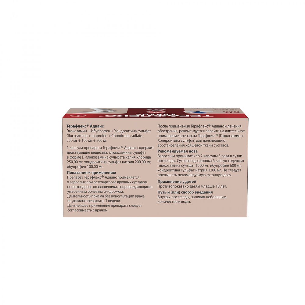 Терафлекс Адванс представляет собой комбинированный препарат, содержащий в качестве активных компонентов хондроитина сульфат, глюкозамина сульфат и ибупрофен. Хондроитина сульфат участвует в построении и восстановлении хрящевой ткани, защищает ее от разрушения и улучшает подвижность суставов.