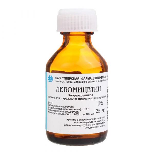 Действующее вещество:, Хлорамфеникол (левомицетин) - 3 г, Вспомогательное вещество:, Этанол (этиловый спирт) 70% - до 100 мл