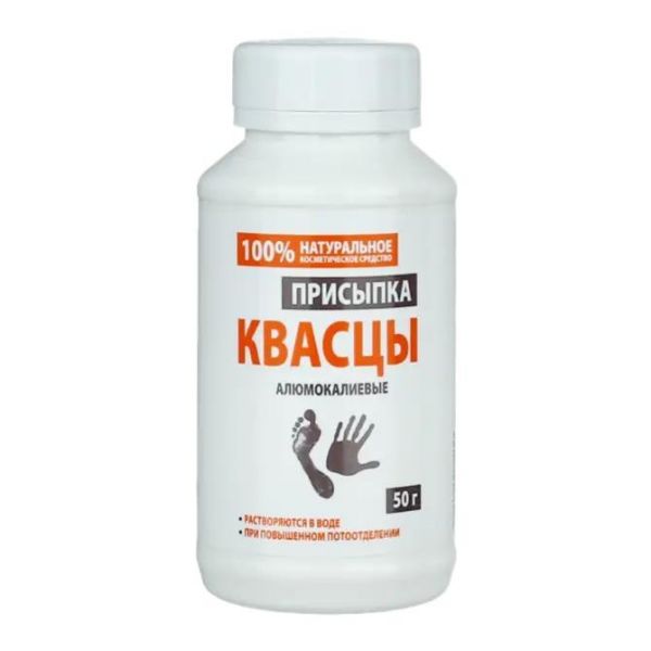 Квасцы - 100% натуральное косметическое средство. Присыпка. 50 г. Растворяется в воде. Используется при повышенном потоотделении ног, подмышечных впадин и других участков тела. Устраняет зуд и отечность от укусов комаров и мошек. Широко используется в косметологических средствах.