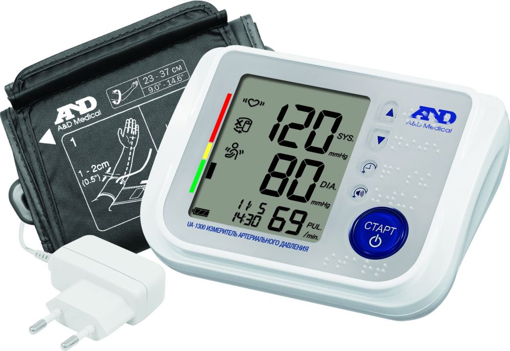 Автоматический тонометр AND (Эй энд Ди) UA-1300 с голосовым помощником, шрифтом Брайля, с крупным дисплеем, интеллектуальным управлением, сетевым адаптером, стандартной манжетой 23–37 см для средней и полной руки и чехлом для хранения.