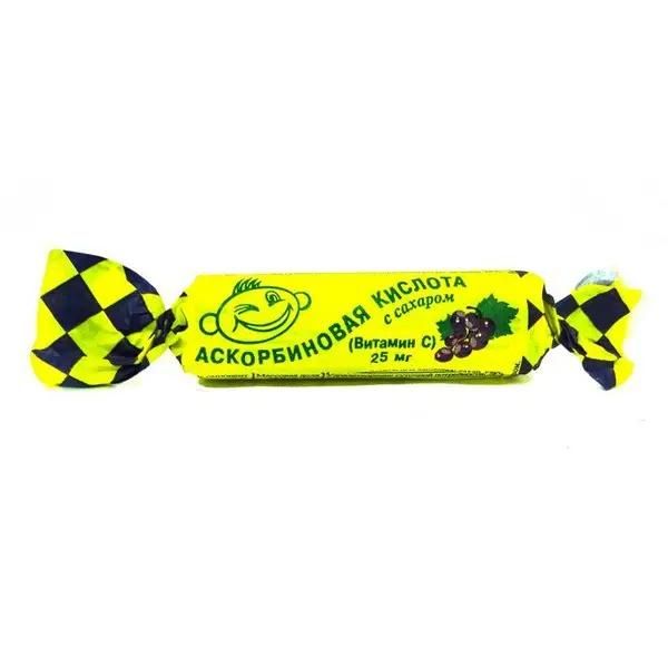 Таблетки жевательные 3г по 10 штук в парафинированной бумаге. Состав: аскорбиновая кислота 25мг, сахар, глюкоза, крахмал, стеарат кальция.