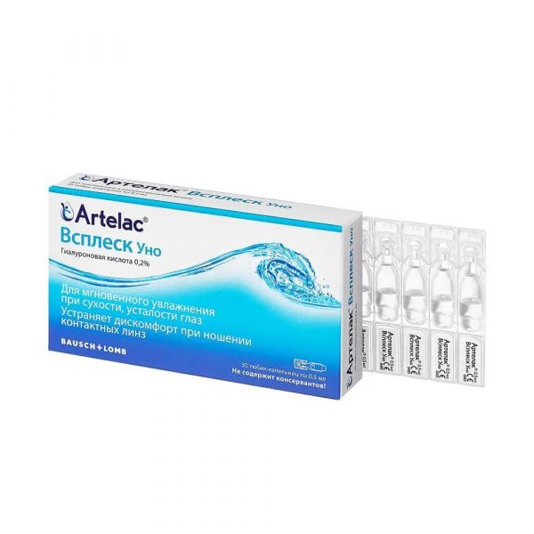 Артелак® Всплеск Уно предназначен для облегчения симптомов и увлажнения при синдроме сухого глаза. Он естественным образом освежает и успокаивает глаза, облегчая симптомы сухости глаз, такие как зрительное утомление, стресс и регулярное слезотечение., Артелак® Всплеск Уно подходит для смачивания и увлажнения как мягких, так и жестких контактных линз при ношении, и делает их использование значительно более комфортным в течение всего дня., Артелак® Всплеск Уно показан при сухости глаз, вызванной факторами окружающей среды., К таким факторам обычно относятся: длительная работа за компьютером, пребывание в кондиционируемом помещении, редкое моргание, сигаретный дым, а также ветреная погода., Кроме того, важную роль в развитии сухости глаз могут играть некоторые лекарственные препараты (такие как противозачаточные средства, антигистаминные препараты, бета-блокаторы, спазмолитики и диуретики), некоторые заболевания или наличие консервантов в некоторых глазных каплях., Артелак® Всплеск Уно увлажняет глаза, облегчая такие симптомы, как раздражение, сухость или зрительное утомление, ощущение инородного тела в глазу или слезотечение., Учитывая свойства данного продукта, положительный результат от его применения могут получить также потребители с хроническим синдромом сухого глаза.