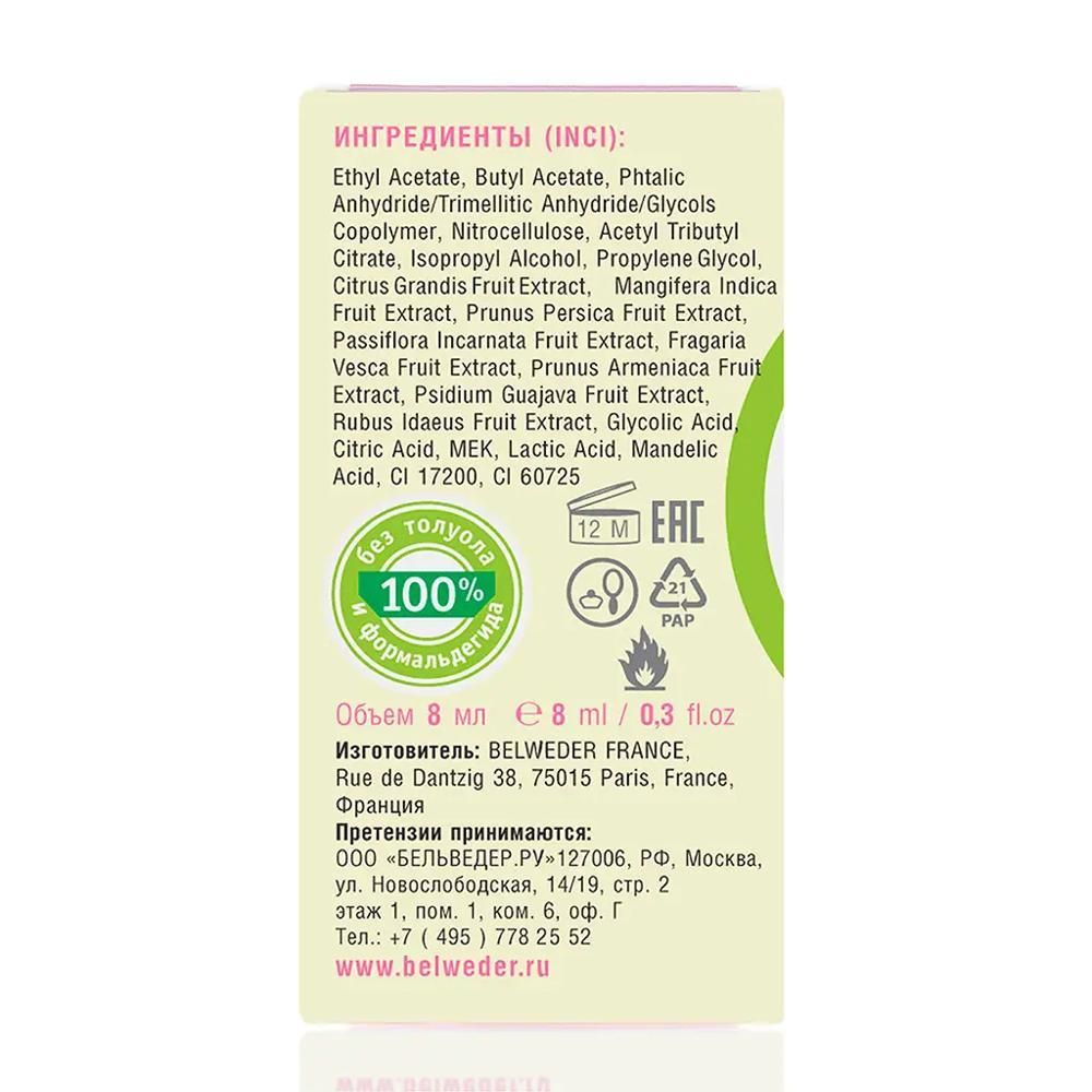 100 % без толуола и формальдегида., Фруктовые кислоты (АХА), экстракт персика, экстракт земляники, экстракт малины, экстракт абрикоса, экстракт грейпфрута, экстракт манго, экстракт гуавы, экстракт страстоцвета.