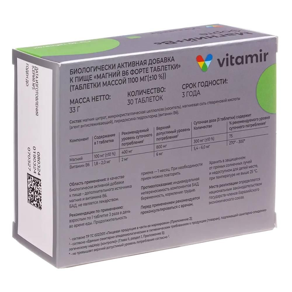 Магний принимает участие в более чем 300 ферментативных реакциях. Он нужен для выработки белка, ДНК, для расщепления глюкозы, выведения из организма токсинов, для усвоения витамина С, тиамина (В1) и пиридоксина (В6). Магний способствует устойчивости структуры клетки в процессе роста, принимает участие в процессе регенерации клеток организма, благотворно влияет на работу внутренних органов, снижает раздражительность и защищает от радиации., Витамин В6 (пиридоксина гидрохлорид) улучшает всасывание магния из ЖКТ и его проникновение в клетки тела, участвует в синтезе гормонов, а также нуклеиновых кислот, повышающих иммунитет и предотвращающих процессы старения., Магний и женский организм Магний поможет устранить симптомы ПМС. Предменструальная страсть к шоколаду объясняется недостатком магния в организме. «Магний В6 ФОРТЕ ВИТАМИР®» поможет восполнить нехватку магния, не прибавляя Вам калорий., Магний и кости Сегодня уже доказано, что потребление необходимого количества магния значительно повышает минеральную плотность костной ткани. Причем, как оказалось, для здоровья наших костей магний гораздо важнее кальция. Здоровье костей зависит не только от кальция, но очевидно, что от магния оно зависит не меньше. С помощью магния растут хрящевая и костная ткани, усваиваются кальций и витамины группы B, С, Е., Магний и мышцы Магний повышает выносливость. Для группы американских спортсменов был проведен эксперимент: перед важными соревнованиями они принимала магний. Результаты превзошли все ожидания. К тому же практически исчезли жалобы на боли в груди, возникавшие во время усиленных тренировок ранее., Магний и память, эмоции Если у Вас повышенная тревожность, магний поможет справиться со стрессом. Этот микроэлемент повышает интерес к новому, снимает некоторые виды мигреней, улучшает память., Магний и сердце У большинства пациентов, имеющих сердечно-сосудистые заболевания, наблюдается дефицит магния. Больным, которых готовят к операциям на сердце, рекомендуется назначать магний, чтобы нормализовать кровяное давление, свести к минимуму возможность нарушения сердечного ритма и аритмии. Употребление магния содержащий препаратов в качестве профилактики поможет снизить риск возникновения сердечно-сосудистых заболеваний., Магний и фигура Магний улучшает пищеварение, помогает продвижению пищи по кишечнику, утилизации белков и жиров, стабилизирует гены, отвечающие за ожирение. Если в вашей семье есть склонность к полноте, то в присутствии магния эти гены не раскроются. Магний снижает уровень «стрессовых» гормонов, спасая от переедания.