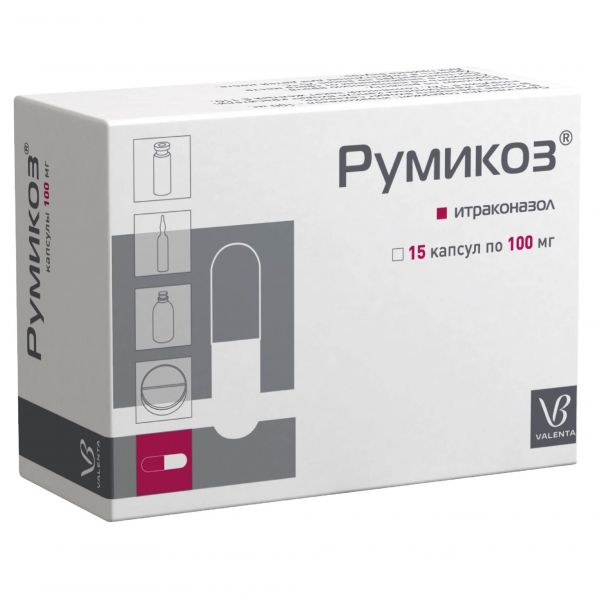 Итраконазол в основном расщепляется ферментом CYP3A4. При одновременном применении итраконазола с рифампицином, рифабутином, фенитоином, карбамазепином, изониазидом, являющимися мощными индукторами CYP3A4, биодоступность итраконазола и гидроксиитраконазола значительно снижается, что приводит к существенному уменьшению эффективности препарата. Одновременное применение Румикоза® с данными препаратами, являющимися потенциальными индукторами печеночных ферментов, не рекомендуется.