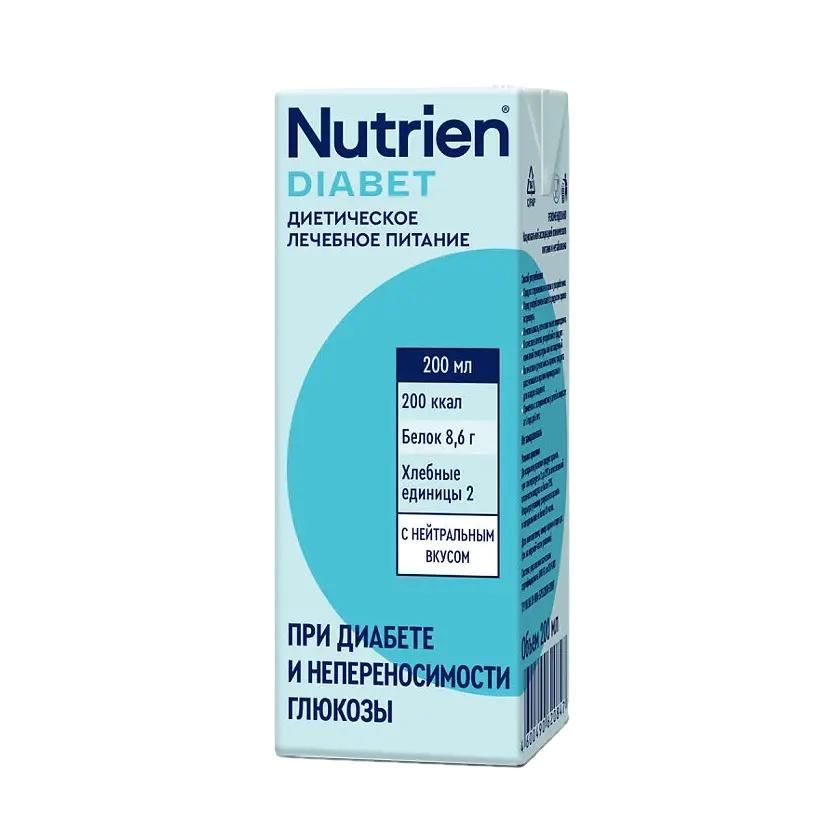 Nutrien® Diabet (Нутриэн® Диабет) 200 мл - Полноценный специализированный продукт для диетического лечебного (энтерального) питания при сахарном диабете 1 и 2 типа, с ограниченной переносимостью глюкозы и стрессиндуцированной гипергликемией, а также с различными заболеваниями, включая критические состояния. Может быть назначен пациентам с проблемами ЖКТ для нормализации микробиоты и моторики кишечника., Состав Nutrien® Diabet полностью сбалансирован: в него входят витамины, питательные вещества и микроэлементы, которые нужны для нормального самочувствия и жизнедеятельности., Белки представлены нативным молочным белком, который легко усваивается и обладает высокой биологической ценностью и биодоступностью. Белковый компонент сбалансирован профилем аминокислот, предотвращающим развитие белковой недостаточности и диабетической ангиопатии., Жиры состоят на 50% из среднецепочечных трилицеридов, что способствует быстрому усвоению энергии, даже в условиях ферментативной недостаточности (отсутствие или дефицит липазы)., Углеводный компонент не содержит дисахаров и инсулинозависимых моносахаров, представлен в основном, мальтодекстринами с низкой степенью гидролиза и фруктозой, метаболизируемой инсулинонезависимым путем., Соотношение углеводных компонентов (фруктоза и мальтодекстрин) обеспечивает снижение гликемической нагрузки у больных диабетом, не вызывает резкого и быстрого повышения уровня глюкозы в крови, фруктоза не требует инсулин для усвоения., Композиция растворимых и нерастворимых пищевых волокон и пребиотиков нормализует процесс пищеварения, обладает пребиотическим и антиатерогенным действием, замедляет скорость всасывания углеводов в пищеварительном тракте, предотвращая повышение уровня глюкозы в крови после приема пищи., Оптимальное соотношение ПНЖК (Омега 6, Омега 3 жирные кислоты), витаминно-минеральный комплекс обеспечивают выраженный антиоксидантный и иммуномодулирующий эффект., Хорошая органолептика (не приторные, низкая вязкость) способствует высокой приверженности к диетотерапии., Не содержит глютен, лактозу и холестерин в клинически значимых количествах., Не содержит искусственных красителей и ароматизаторов., Гликемический индекс 18,7.