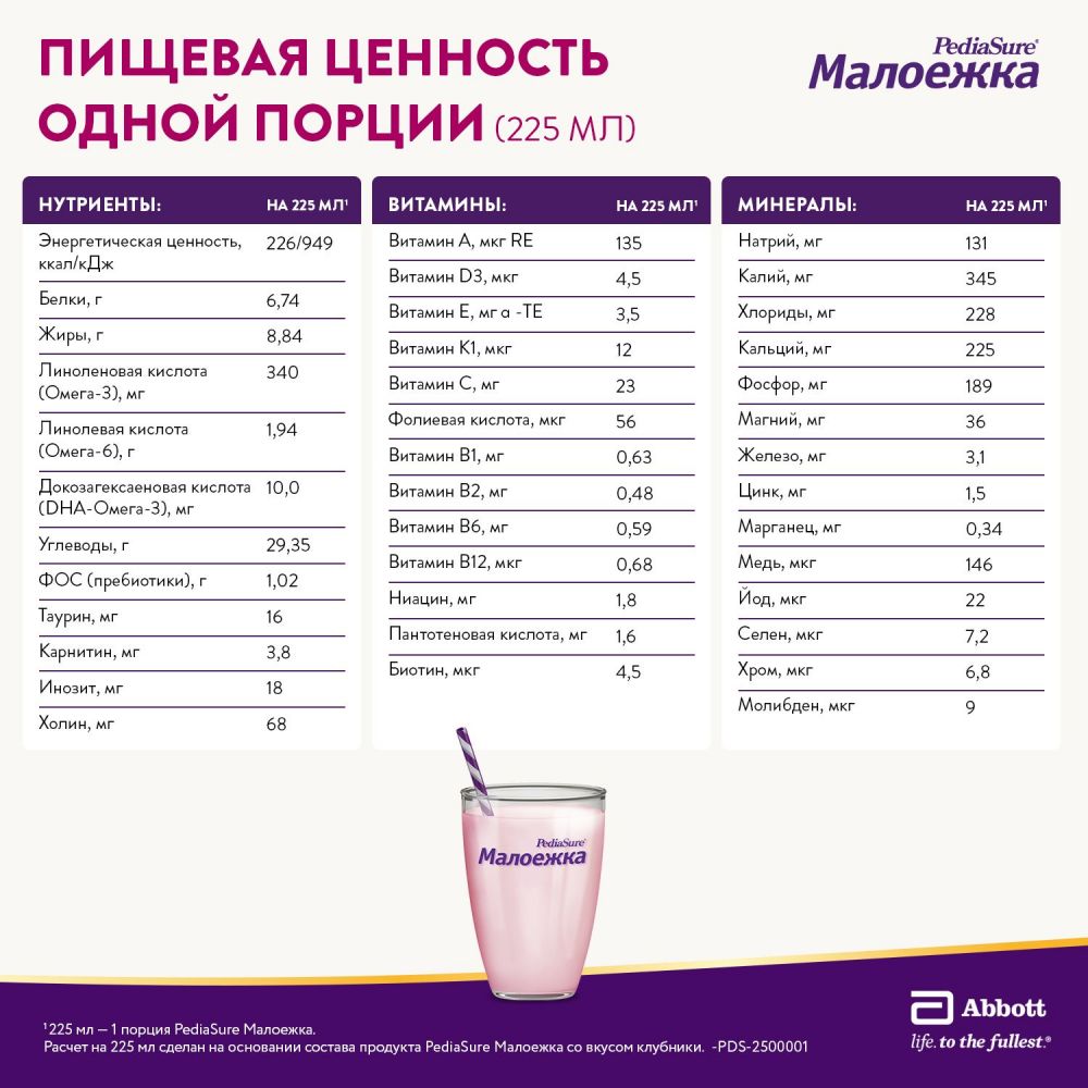 В отличие от популярных перекусов (таких как молоко детское, йогурт питьевой, молочный коктейль, пюре в паучах или печенье), Малоежка от ПедиаШур — это сбалансированное сочетание полноценного белка, жиров, углеводов, а также всех необходимых витаминов и минералов, которое поможет обеспечить ребенка хорошим уровнем энергии.