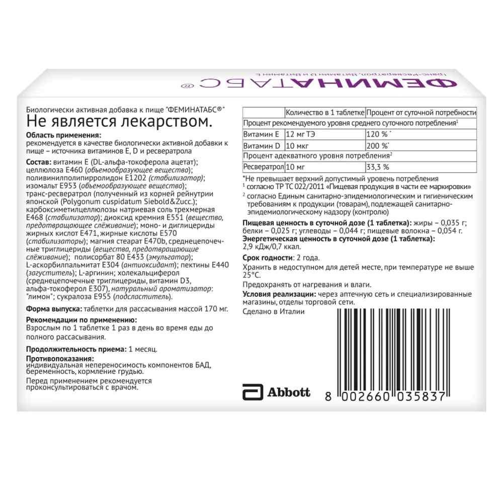 Феминатабс® – специально разработанная для женщин биологически активная добавка, представляет собой дополнительный источник ресвератрола, витаминов Е и D4. Ресвератрол – фитоэстроген природного происхождения, обладающий эстрогеноподобным и антиоксидантным действиями, которые обусловливают его разнонаправленные антивозрастные эффекты.Высокая биодоступность ресвератрола достигается благодаря сублингвальной нанотаблетке Sublingual Nanotablet Technology®Витамин Е способствует улучшению состояния кожи, ногтей и волос.Витамин D3 необходим для поддержания здоровья костной системы и профилактики остеопороза.Феминатабс® это:• фитоэстрогены нового* поколения от Abbott• негормональная поддержка женского здоровья• новая комбинация ресвератрола с витаминами Д и Е направленная на борьбу против возрастных изменений