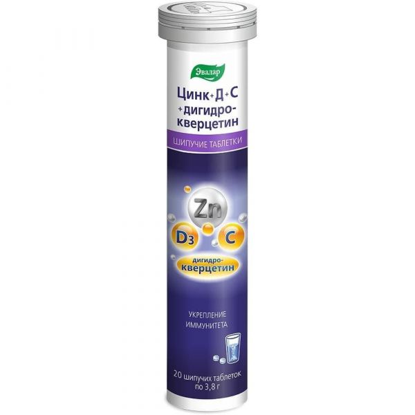 ирусы, бактерии, инфекции… Наш иммунитет постоянно подвергается их атаке. В периоды, когда эти болезнетворные организмы особенно активны, иммунная система уже не может справляться самостоятельно и нуждается в дополнительной поддержке. Но что же выбрать среди всего обилия противовирусных средств? Цинк+D+С+дигидрокверцетин в форме шипучих таблеток от компании «Эвалар» ­­ – это усовершенствованная формула для защиты от вирусов и тромбов, укрепления иммунитета, сердца, сосудов и бронхолегочной системы. Он сочетает в себе сразу несколько активных иммуностимулирующих компонентов, которые в комплексе усиливают действия друг-друга: цинк, витамин D, витамин С и дигидрокверцетин. Шипучие таблетки моментально растворяются в стакане воды, благодаря чему активные компоненты быстрее проникают в кровь, легко усваиваются организмом, не вызывая раздражения желудка.