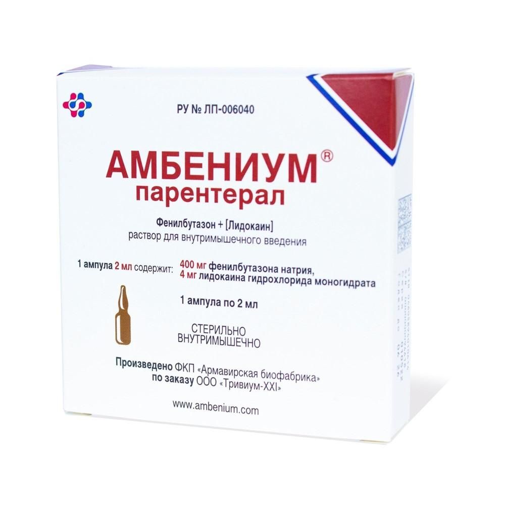 Симптоматическое лечение болевого синдрома и воспаления при обострении: анкилозирующего спондилита (болезнь Бехтерева), артрита (в том числе ревматоидного), подагры; купирование острой боли в нижней части спины (дорсалгии). Препарат предназначен для симптоматической терапии, уменьшения боли и воспаления на момент использования, на прогрессирование заболевания не влияет. Применение АМБЕНИУМ парентерал в основном должно производиться только в том случае, если другие терапевтические мероприятия, включая другие нестероидные противовоспалительные препараты, не оказали достаточного обезболивающего эффекта. Применение фенилбутазона в дозе, превышающей рекомендуемую (373,4 мг), или дополнительное применение других НПВП (исключение составляет ацетилсалициловая кислота в дозах не более 325 мг, применяемая в качестве антиагреганта) не обеспечивает дополнительного обезболивающего эффекта, но существенно повышает риск развития нежелательных явлений и поэтому не рекомендуется.