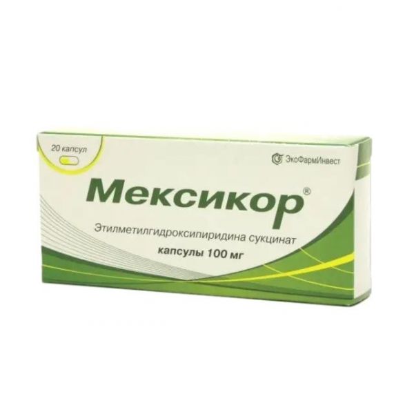 Фармакодинамика Антиоксидантный препарат. Этилметилгидроксипиридина сукцинат оказывает антиоксидантное, антигипоксическое, противоишемическое, мембранопротекторное, ноотропное, стресс-протективное, противосудорожное, анксиолитическое действие. Препарат способствует повышению резистентности организма к воздействию различных повреждающих факторов, при кислородзависимых патологических состояниях (шок, гипоксия и ишемия, нарушения мозгового кровообращения, ИБС, интоксикация этанолом и состояние после интоксикации антипсихотическими средствами). Препарат уменьшает проявления окислительного стресса, ингибирует свободнорадикальные процессы перекисного окисления липидов, повышает активность супероксиддисмутазы. Модулирует активность мембраносвязанных ферментов – кальцийнезависимой ФДЭ, аденилатциклазы, ацетилхолинэстеразы, рецепторных комплексов (бензодиазепиновый, гамма-аминомасляный, ацетилхолиновый), что усиливает их способность связывания с лигандами, помогает сохранению структурно-функциональной организации биологических мембран, улучшает транспорт нейромедиаторов и синаптическую передачу. Повышает содержание дофамина в головном мозге. Препарат вызывает усиление компенсаторной активности аэробного гликолиза и способствует снижению степени угнетения окислительных процессов в цикле Кребса в условиях гипоксии с увеличением содержания аденозинтрифосфата, креатинфосфата и активацией энергосинтезирующих функций митохондрий, стабилизацию клеточных мембран. У больных стабильной стенокардией напряжения повышает толерантность к физической нагрузке и антиангинальную активность нитропрепаратов, улучшает реологические свойства крови. Добавление препарата Мексикор ® к стандартной терапии ИБС улучшает клиническое состояние пациентов, увеличивая толерантность к физическим нагрузкам и улучшая качество жизни. Энергосинтезирующий эффект препарата Мексикор ® связан с увеличением доставки и потребления клетками сукцината, реализацией феномена быстрого окисления янтарной кислоты сукцинатдегидрогеназой, а также с активацией митохондриальной дыхательной цепи. При диссоциации этилметилгидроксипиридина сукцината в клетке на сукцинат и производное 3-оксипиридина (основание), основание проявляет антиоксидантное воздействие, стабилизирующее клеточные мембраны и восстанавливающее функциональную активность клеток. Препарат улучшает функциональное состояние ишемизированного миокарда при инфаркте миокарда, улучшает сократительную функцию сердца, а также уменьшает проявления систолической и диастолической дисфункции левого желудочка. Нормализует метаболические процессы в ишемизированном миокарде, уменьшает зону некроза, восстанавливает электрическую активность и сократимость миокарда, а также увеличивает его коллатеральное кровоснабжение, активизируя энергосинтезирующие процессы в зоне ишемии и способствуя сохранению целостности кардиомиоцитов и поддержанию их функциональной активности. Эффективно восстанавливает сократимость миокарда при обратимой сердечной дисфункции, что представляет существенный резерв повышения сократительной способности сердца у больных ИБС. У больных со стабильной стенокардией напряжения повышает толерантность к физической нагрузке и антианг