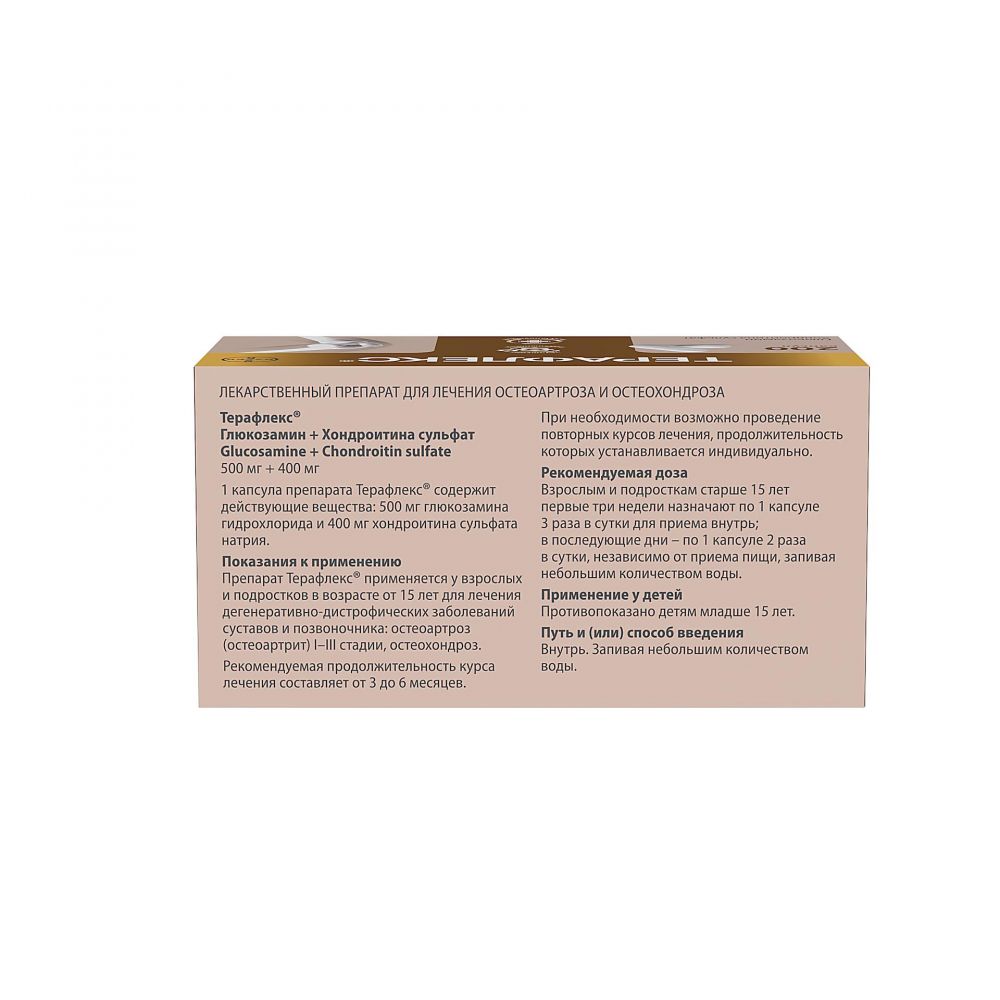 Сильнее состав - здоровее сустав(1). , Терафлекс препарат №1 для лечения остеоартроза и остеохондроза(2) ., Терафлекс современный хондропротектор, который производится в США в соответствии с высокими стандартами качества компании Bayer., Доказано(3), что Терафлекс способствует:, - Обновлению хрящевой ткани сустава, - Улучшению подвижности суставов, - Уменьшению боли, И препятствует дальнейшему развитию заболевания(4)., Терафлекс обладает комплексным действием: он способствует восстановлению хрящевой ткани сустава, а также снижению потребности в применении обезболивающих средств, увеличивая безопасность лечения., В отличие от некоторых других препаратов группы, он содержит усиленную суточную дозировку(5) одних из самых изученных активных веществ: глюкозамина и хондроитина(6)., Терафлекс выпускается в идеальной форме капсул(7), поэтому:, - включает в себя только необходимые действующие вещества без лишних дополнительных примесей;, - легко усваивается организмом., Терафлекс необходимо принимать курсами, эффект лечения может наступать постепенно и призван сохраниться в течение длительного времени(8). Курс лечения от 3 до 6 месяцев: первые три недели назначают по капсуле 3 раза в сутки; в последующие дни по капсуле 2 раза в сутки., Поддерживайте здоровье суставов курсами 2 раза в год, и суставы будут Вам благодарны.(9), Терафлекс 200 капсул это экономичная упаковка, рассчитанная на полный курс лечения.(10), 1. Fransen M. et al. Glucosamine and chondroitin for knee osteoarthritis: a double-blind randomised placebo-controlled clinical trial evaluating single and combination regimens. Ann Rheum Dis. 2015 May;74(5):851-8., 2. По данным ООО Ай Эм Эс Хэлс, полученных из базы Розничный аудит ГЛС и БАД в РФ, Терафлекс является лидером по объему продаж препаратов из групп 02G2C Препараты для суставов, системные, 02Е2С Препараты при мышечной боли, системные и 02Е1О Препараты при мышечной боли для наружного применения (классификация ОТС) за периоды сентябрь 2016 август 2017 года., 3. Чичасова Н.В. Лечение боли у пациентов с остеоартрозом различной локализации // Медицинский совет. - 2014. - №17. - 96-102., 4. Через 3 года терапии препаратом Терафлекс число больных с рентгенологическим прогрессированием гонартроза отличалось на 25% от контрольной группы (р˂0,05). Светлова М.С. Патогенетическое лечение остеоартроза коленных суставов // Современная ревматология. - 2012. - №3. - с.44-49, 5. Рекомендуемые суточные дозы при приеме капсул Терафлекс превышают таковые у некоторых препаратов глюкозамина и хондроитина, согласно базе данных ГРЛС на 26.07.2018 г, 6. Кадурина Т.Н., Аббакумова Л.Н. Принципы реабилитации больных с дисплазией соединительной ткани // Лечащий врач. 2010. № 4. С. 1719., 7. Для комбинированных лекарственных препаратов. Cole G. Evaluating Development and Production Costs: Tablets Versus Capsules. Pharmaceutical Technology Europe; Vol. 5, Pgs. 17 26 (1998)., 8. По данным сравнительного исследования с участием 100 больных с ОА эффект купирования боли сохранялся на протяжении 3 месяцев после прекращения лечения. Алексеева Л.И., Кашеварова Н.Г., Шарапова Е.П., Зайцева Е.М., Северинова М.В. Сравнение постоянного и интермиттирующего лечения больных остеоартрозом коленных суставов комбинированным препаратом Терафлекс // Научно-практическая ревматология. - 200 - №3. - с.68-72., 9. Федеральные клинические рекомендации по диагностике и лечению остеоартроза, Ассоциация ревматологов России, 2016, 19 стр., 10. Согласно данным базы ООО АЙКЬЮВИА СОЛЮШНЗ средняя розничная цена в руб.