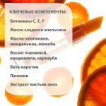 Витамины C, E, F - потенцируют антиоксидантное действие друг друга. Улучшают состояние кожи, особенно в период стрессов, болезни или авитаминоза. При регулярном использовании кожа выглядит более свежей, гладкой и здоровой , Масла: хлопковое, миндальное, жожоба, - увлажняют, разглаживают, питают кожу губ. Устраняют симптомы раздражения кожи (шелушение, покраснение, болезненность) Воски: пчелиный, канделилла, карнауба, - формируют защитную пленку , Ланолин – высокоочищенный. Восстанавливает эластичность, разглаживает и увлажняет кожу губ , Экстракт листьев алоэ – содержит аминокислоты, кальций, железо, магний, фосфор, цинк, витамины А, В1, В2, В3, С и Е. Обладает способностью ускорять регенерацию клеток кожи, устраняет признаки воспаления, защищает кожу от повреждения UV-лучами , Бета-каротин – провитамин А – антиоксидант , Масло сладкого апельсина – эфирное масло, обладает антиоксидантным и бактерицидным действием, позитивно влияет на эмоциональное состояние