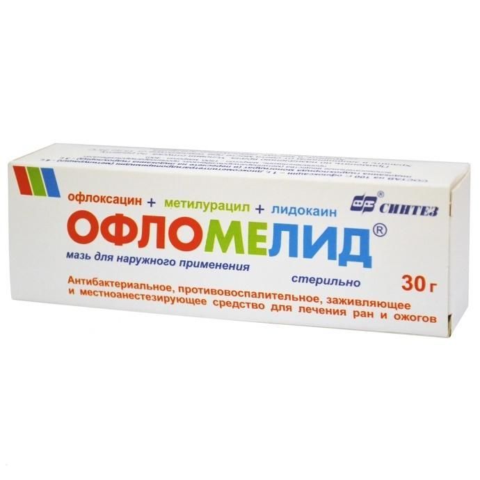 Офломелид® - комбинированный препарат, оказывает противомикробное, противо-воспалительное, местноанестезирующее, регенерирующее действие. Активными веществами являются офлоксацин, метилурацил и лидокаин.